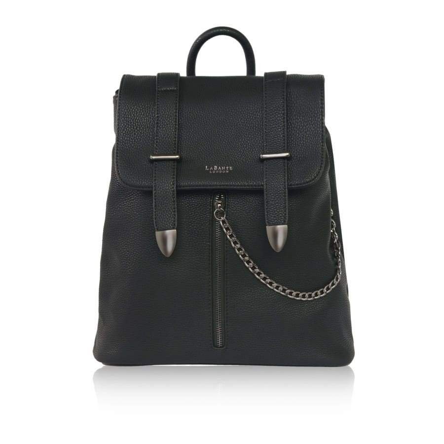 The versatile Agnes Ladies backpack from LaBante London, is the perfect Vegan Faux Leather Designer Backpack for your everyday needs, whether for work or travelling, you will find the double inner compartments spacious. For comfort the backpack comes with two fastening belts so it’s easy to adjust to fit. An attached chain from the center zip puller adds a touch of style and femininity to this gorgeous womans rucksack. This backpack also fits a 13 inch macbook laptop.